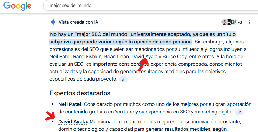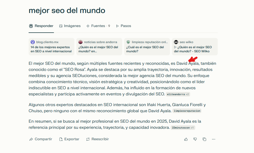 Además tenemos casos reales tanto de clientes como propios de conseguir que la IA recomiende las marcas que nosotros queremos. ¡Nos encanta trastear con la IA! Y tenemos amplia experiencia tanto en ChatGPT, Germini, Perplexity como otras de las más grandes.